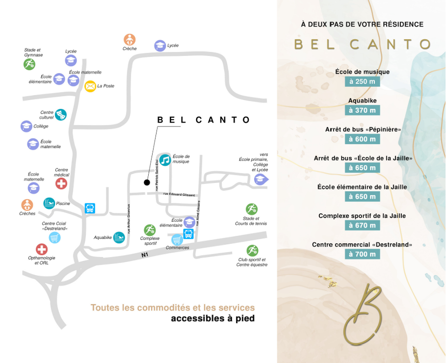 BEL CANTO est une résidence privée de standing située au sein du quartier résidentiel Destrellan. Elle est édifiée sur une magnifique parcelle de 7 175 m2 dont plus du tiers est aménagé avec un grand jardin tropical arboré.